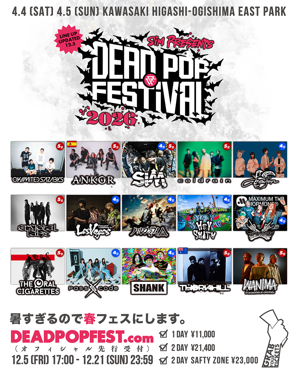 2026年4月4日(土)、 5日(日)に開催される『DEAD POP FESTiVAL 2026』の出演日が決定しました!